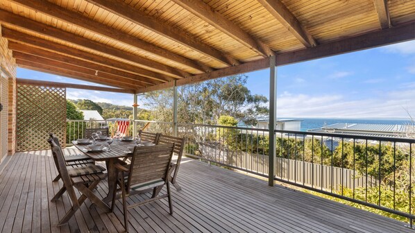 We had a great week away at this beach house with my husband and our two dogs. The view from the house was absolutely amazing and waking up to the ocean each morning was really lovely. The back deck quickly became our favourite spot for morning coffees, afternoon drinks and dinner. The dogs were well secured in the fenced back yard. The house itself was comfortable and fairly well equipped. The driveway is 4WD only so parking available is on the street outside the property, which wasn’t a problem for us. Also, there are building sites next door and across the road, which added a touch of industrial chic to our otherwise tranquil escape. Fortunately, the ocean view was loud enough to drown out the occasional hammer and we were out most of the time the builders are operational. All in all, a lovely stay in a beautiful location.