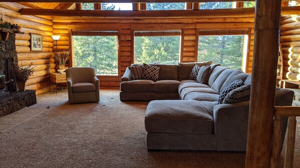 The main floor boasts traditional log beams spanning an open living room with a large sectional, smart TV with Disney+ and Netflix and a lava rock wood-burning fireplace. The living room opens to a large dining area that is open to the kitchen. The dining area has 2 tables that each seat 8, as well as 4 bar stools. There is plenty of room to set up the available banquet table for more table dining. The kitchen is well equipped and has gorgeous views out toward the meadows. There is also a laundry area beyond the kitchen with a washer and dryer. The main floor also has a bedroom with a queen bed and a full bath with a deep soaking Whirlpool jetted bathtub.