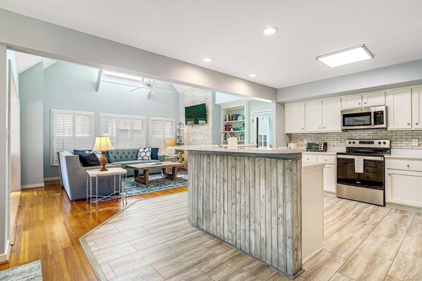When you walk in the front door the airy and bright open floor plan directs your eyes to the spaciousness of the main living area. Livingroom, dining room, kitchen and even a sunroom allows for plenty of space for everyone to gather comfortably. Prepare wonderful meals for 10 in the well equipped kitchen; enjoy a casual grilled dinner or a lively game in the dining space or the sports game of your liking on the large screen TV. There are 2 bedrooms and 2 bathrooms on the main floor, one being the primary with a King bed and en suite bathroom. The primary also has its own deck access! The second bedroom has 2 twin beds and a bathroom with tub and shower combo. There is a great deck off the main living space outdoor meals prepared on the grill or just enjoying your morning coffee with the peek a boo ocean view.