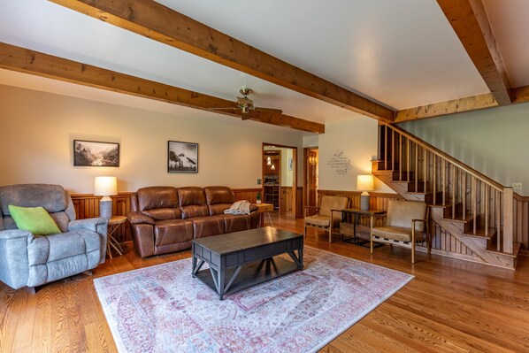The heart of the home is the expansive living room, featuring a gorgeous stone fireplace and comfortable seating arranged around it to enjoy the warmth of the gas logs or gather to watch TV. The well-appointed kitchen is stocked with all the essentials and offers ample counter space, making meal preparation a breeze. The adjacent dining room comfortably seats six, with additional seating for four just off the kitchen. A convenient half bath is located nearby for ease of access.