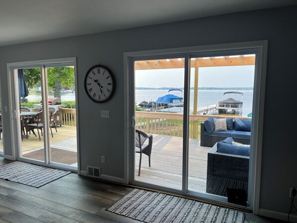 Newly renovated top to bottom, quiet location with fantastic views. Can't say enough positive things about the hosts. Very engaged and pride of ownership shines through. All kinds of lake "toys" to enjoy, gas bbq and fire pit were used a lot. Fully equipped kitchen. Washer & dryer. AC but not necessary with fans in all rooms. Outside deck has not been fully enclosed as yet. Very comfortable lounges and sofas as well as patio table and chairs. A couple minor issues with the newly added upstairs- towel racks in bathrooms or hanging poll for clothes not yet installed. The view from the master bedroom, on the second floor, is spectacular. The master bedroom is very large and includes a comfortable chair and ottoman. Kids dorm had four beds with attached bathroom (nice design touch by owners). Definitely, would recommend for family gatherings.