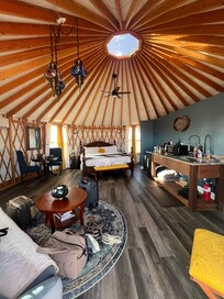 Escape to the Mystic Yurt, a luxurious 450 sq foot retreat that exudes warmth and luxury. Lose yourself in relaxation with great hot showers, AC and heat, farmhouse sink, microwave and fridge at your fingertips.