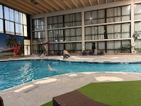 Travelers can challenge friends to arcade games or enjoy quiet laps in the indoor pool while planning theme park adventures with high-speed WiFi