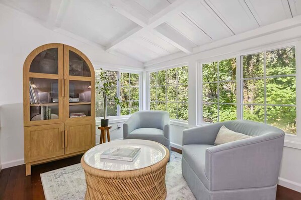 We designed this space to help you slow down. There is a dedicated reading nook with classic farmhouse windows that swing open to invite the fresh air and sunshine in. Just beside it, you’ll find a vintage-style record player in the cabinet. The best way to enjoy this house? Pick a record, sink into the reading chair, and listen to music mixed with the sound of the creek outside.