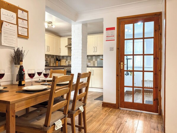 Bedroom 2: 2 x Single (3ft) Beds. Gas central heating, gas, electricity, bed linen, towels and Wi-Fi included. Cot and highchair.. Small, rear enclosed courtyard with garden furniture. On road parking. Visit England 4 Star. No smoking.. This beautiful semi-detached cottage has been decorated with great care and attention to ensure a high level of guest satisfaction. Sleeping up to four adults, this property is very well equipped, offering one double bedroom and one twin bedroom both dressed in comfortable linens to ensure a restful night’s sleep for all, with the flexible arrangements making it perfect for families and couples. The hub of this cottage is undoubtedly the fantastic open-plan kitchen and dining room, with French doors leading into the living room. This truly makes a great open-flowing space, especially good for kids, so you can always keep an eye on them, with an airy yet cosy ambience throughout.