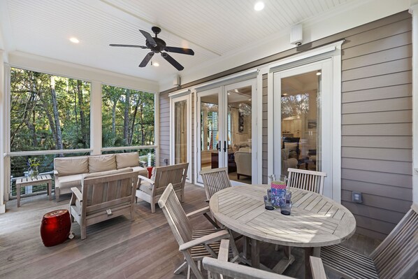 It's the outdoor space that really makes this home special. Enjoy evening cocktails or alfresco dining on the expansive screened porch. Lounge in the sun with a good book on the pool deck. Take a dip in the large saltwater pool after a long day at the beach. Simply relish in the beautiful surroundings of the Lowcountry, filled with lush maritime plants and trees and the soothing sounds of local birds and wildlife. And for a little added fun, the property does have a ping pong table and corn hole available guest use!