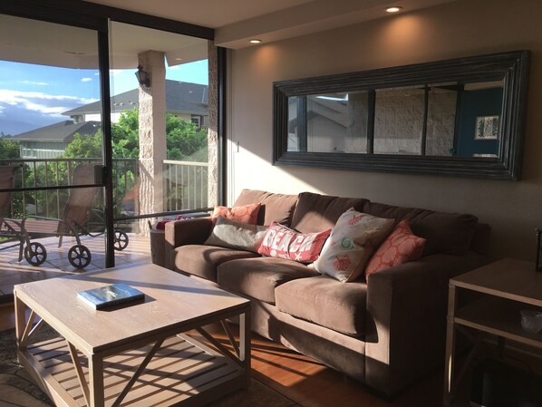 Living room has beautiful views of the ocean and mountains. You can enjoy watching the whales right off your lanai during whale season. The living room is very spacious and has many upgrades, including a flat screen TV, A/C, pull out sleeper sofa, and a sound system for watching tv or listening to music.