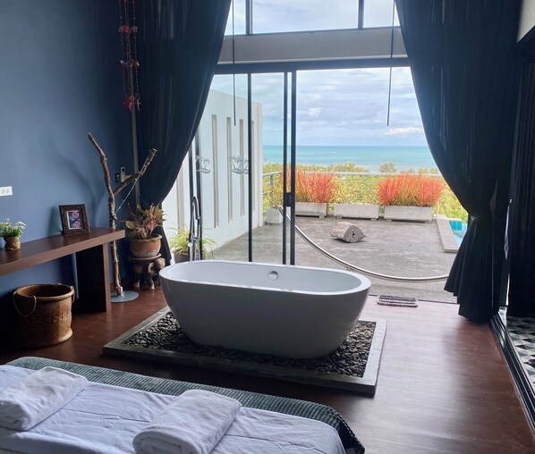 The other two bedrooms includes a rain shower with a tiled pebbled floor that gently massagers your feet whilst you bathe, wc and wash hand basin. There is plenty of storage with fitted wardrobes makeup table and linen basket. The rooms also enjoy a comfortable super king size bed with beautiful views of the lush green jungle and the sea beyond.