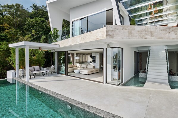 Perched on a hill overlooking Chaweng Beach, Icon Villa is an ultra-luxurious oceanfront haven offering three spacious bedrooms with king-size beds and en-suite bathrooms. Guests can unwind in the grand master suite's private jacuzzi, enjoy modern kitchen amenities or bask in the panoramic views from multiple terraces.