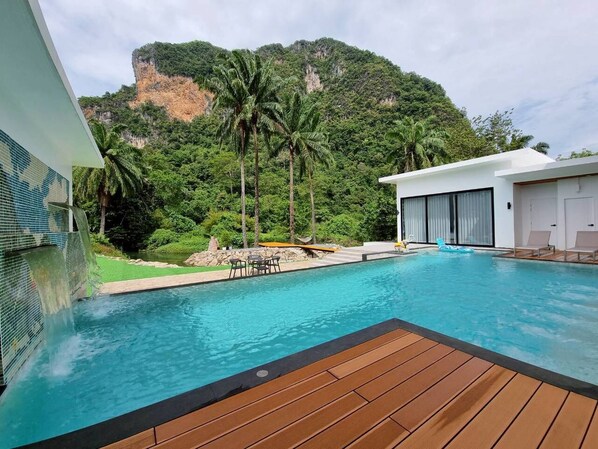 n Impressive and Spacious modern pool villa nestled in the lee of a mountain alongside the bank of a meandering brook offers a secluded and peaceful retreat Surrounded by Nature and Wildlife with a spectacular mountain view.