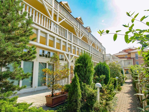 The charming apartment complex in the Strandstraße 14 was built in 1998 in the style of resort architecture with many interesting wooden structures and is located in the district east of the wonderful seaside resort Kühlungsborn. Just a stone's throw away is the center of the district East with numerous bakeries, cafes, restaurants and boutiques as well as shops for daily needs. In just 2 minutes you are at Molli-station Kühlungsborn-Ost, where the bus station is located. To the fine sandy beach and the pier is about 600 m. From the pier you can already enjoy the extravagant view to the marina. The stylishly designed 2- to 3-room apartments are 45 m² to 75 m² in size, partly in two levels with a loft and are suitable for two to five people. The apartments have a bedroom with double bed, some with children's room / guest room, living room with open kitchenette, cable TV and stereo, shower / WC and terraces / balconies / loggias. In the house there are bicycle storage facilities. Our guests have a washer and dryer available for a fee. Have you always dreamed of cycling to the beach? Would you like to visit one of the numerous on-site events by bike? Or do you want to be a little sporty and make a discovery tour by bike on the well-developed cycle path network in the area? No matter what your heart desires: In the bike rental "MY BIKE BY THE SEA" you can on special terms (discount vouchers you receive upon arrival) bicycles, e-bikes, children's bicycles, mountain bikes u. V. M. borrow.