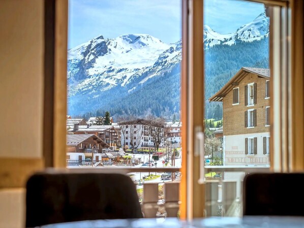 - LIVING ROOM (36.98 m²) : eating place, sofa, flat screen TV, decorative fireplace, east facing French window + balcony Perrière Parking / next door residences / mountain view, south facing bay and French window + balcony, next door residences / ski lifts / mountain view