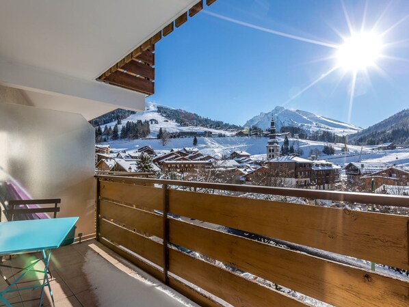 - LIVING ROOM (17.95 m²): eating place, 1 DOUBLE SOFA BED RAPIDO (140), flat screen TV, south facing sliding bay window + balcony, village / mountain view