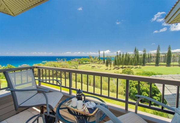 Walk through the ever-so-quiet sliding glass doors out onto your large, private lanai. Here is where you may spend most of your time, soaking in the stunning views of Kapalua and beyond. A raised table with seating for four as well as an additional raised table for two offer unobstructed views, making this spot perfect for dining alfresco, or for sharing evening cocktails. Enjoy sweeping views of the island of Moloka’i clear up the coastline to world famous surf spot, Honolua Bay. During the winter months this is a wonderful space to watch the humpback whales at play!