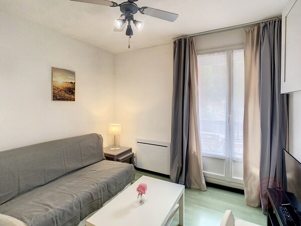 This 17 m² apartment, located on the 1st floor with elevator access, faces east and is 400 meters from the center of Lamalou-les-Bains and 650 meters from the thermal baths. The apartment features a kitchenette with a small refrigerator, microwave, and two-burner ceramic hob, opening onto the main room which includes a sofa bed (140 cm), a flat-screen TV, and a single bed (80 cm) at the entrance. Wi-Fi is included. There is a bathroom with a shower, sink, and toilet. A balcony with a table and chairs is also provided. A laundromat is available in the building. Parking is available nearby. Pets are welcome. A travel cot for a baby can be provided upon request, subject to availability.