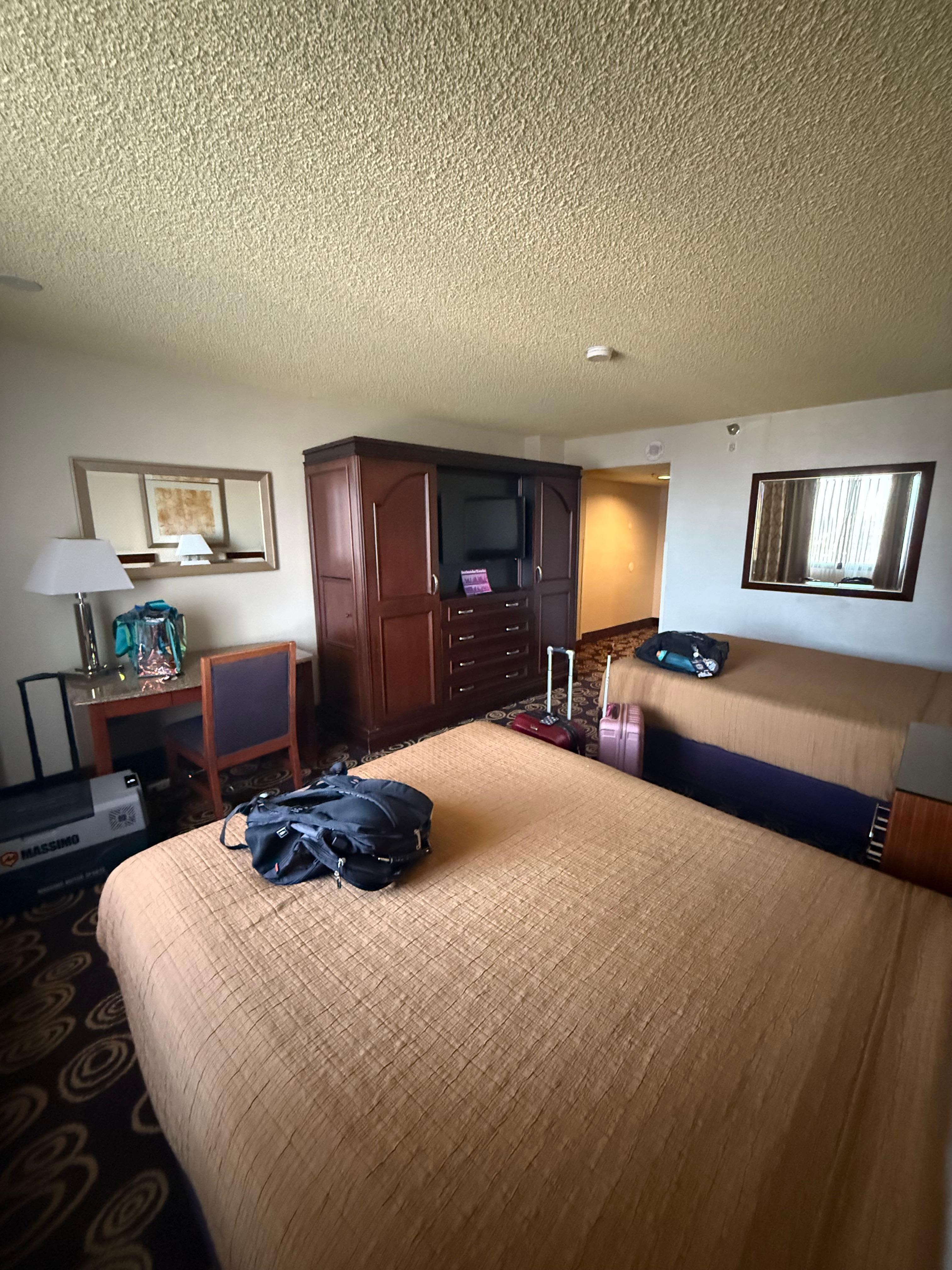 Rooms were decent. Kids loved the pool area and slides. Elevators were ridiculous had to wait over 40 mins every time to get on a elevator. Majority of the time we had to use the stairs due to the elevators system which you had to input your room number, and it assigned a door however sometimes it would cancel your ride or have 10 other floors on one elevator. Employees at front desk were rude when trying to check in which is all done on kiosk.