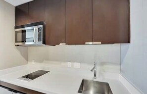 • Sink, 2-burner electric cooktop, microwave, mini refrigerator