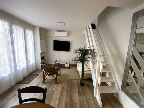 Petite Villa de vacances (35m²) qui vous offre tout le confort nécessaire pour des vacances réussies. Cour / Terrasse équipée d’un store banne et transats. Une belle pièce de vie avec cuisine ouverte de type USA équipée (plaque de cuisson, mini four, micro-ondes, frigo congélateur), coin repas et espace détente avec TV, climatisation. Une chambre en RDC avec lit en 130 (couchage 1/2 personnes), sortie sur la terrasse. Une salle d’eau (douche) avec lave-linge. /WC séparés (accès depuis la salle d’eau). A l’étage, une chambre en mezzanine avec lit en 140 (couchage 2 personnes), climatisation. Equipé pour 4 personnes. Les plus : secteur, parking privé, climatisation. WIFI Linge de maison et draps non fournis. Ménage de fin de séjour non inclus, prestation en supplément.