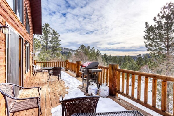 Escape to the Black Hills at this Gorgeous Lodge, where you can unwind with breathtaking views from the deck or private hot tub. Enjoy open living spaces, beautiful decor, and a full kitchen with modern appliances. With two gas fireplaces and satellite TV, cozy up by the fire after a day on the slopes.