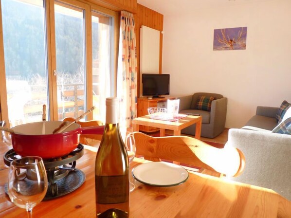 "Tourbillon B 27", 2-room apartment 45 m2 on 2nd floor, south-west facing position. Comfortable and tasteful furnishings: living/dining room with 1 double sofabed (1 x 160 cm, length 190 cm), cable TV and hi-fi system. Exit to the balcony. 1 room with 2 beds (90 cm). Kitchenette (3 hot plates, oven, dishwasher, microwave, electric coffee machine, Capsules for coffee machine (Nespresso) extra, fondue Set (chinoise, cheese)). Shower/WC. Balcony 8 m2, south facing position. Terrace furniture, deck chairs (2), box-room. Beautiful view of the mountains. Facilities: iron. Internet (WiFi, free). Parking. Please note: non-smokers only. Maximum 1 small pet/ dog allowed.