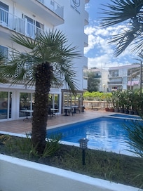 Yes, this property has a seasonal outdoor pool and a children's pool. Pool access is from 8:30 AM to 9:30 PM.