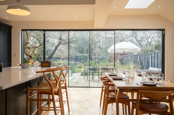 Towards the back of the house is the spectacular, open-plan kitchen and dining room, leading directly to the private garden.
