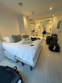 Located just off Exmouth Market, this 5-star studio flat offers a luxurious retreat with top-of-the-range kitchen amenities like sparkling and boiling water taps. Relax in the Murphy bed with super king Tempur mattress and enjoy underfloor heating, or unwind in the bathroom's Rainfall shower.