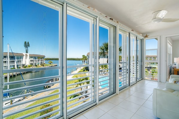 - Expansive water views from the living room, master bedroom, and enclosed lanai
