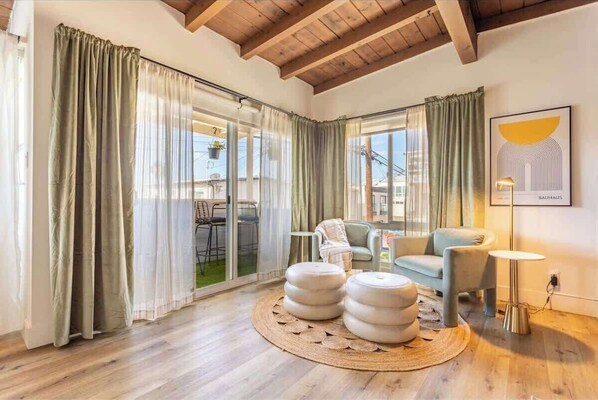 One of the best features of this apartment is the cozy sitting nook by the porch—a perfect little retreat. Open the doors, settle into a comfortable chair, and let the fresh ocean breeze flow in. The open floor plan creates a bright, airy vibe, with a seamless connection between indoors and outdoors. This inviting space perfectly captures the laid-back spirit of coastal living, offering guests a relaxing retreat where comfort meets the charm of the beach lifestyle.