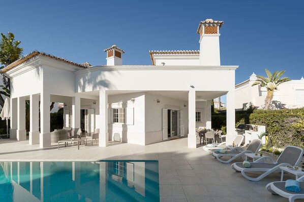 The exterior of this property is equally impressivet. The highlight is the inviting pool, where you can refresh yourself. Surrounding the pool, you will find sun loungers, perfect for soaking up the warm Algarve Sun