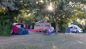 Pagan tent. On flat, shady grounds, with swimming pool. Quietly.