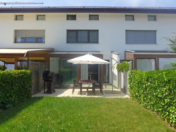 5-room terraced house 190 m2 on 3 levels. Comfortable and tasteful furnishings: living/dining room, on 2 levels with winter garden with digital TV, flat screen and hi-fi system. Exit to the garden. Open kitchen in the entrance (oven, dishwasher, 4 ceramic glass hob hotplates, toaster, kettle, microwave, freezer, electric coffee machine, raclette grill, fondue Set (cheese)) with dining table. On the lower ground floor: sep. WC. Upper floor: 1 room with 1 french bed (1 x 160 cm, length 200 cm). Bath/WC, double hand-basin. 2nd upper floor: 2 rooms, each room with 1 french bed (1 x 140 cm, length 200 cm). Top floor: 1 double bedroom with sloping ceilings with panoramic window with 3 beds and shower/WC. Garden 160 m2. Barbecue, deck chairs, box-room. Partial view of the lake and the countryside. Facilities: washing machine, dryer, iron, children's high chair. Internet (WiFi, free). Parking, garage. Please note: non-smokers only.