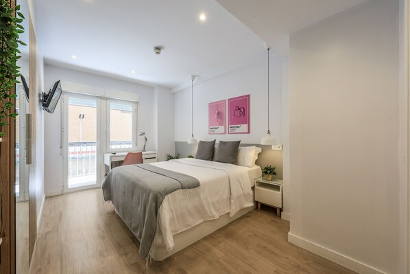 This double room in a quiet, exclusive neighborhood near Madrid's Gran Via features a private balcony, smart TV, and air conditioning. Guests enjoy the shared living room for socializing and the on-site gym. The tranquil atmosphere earns praise from previous guests.