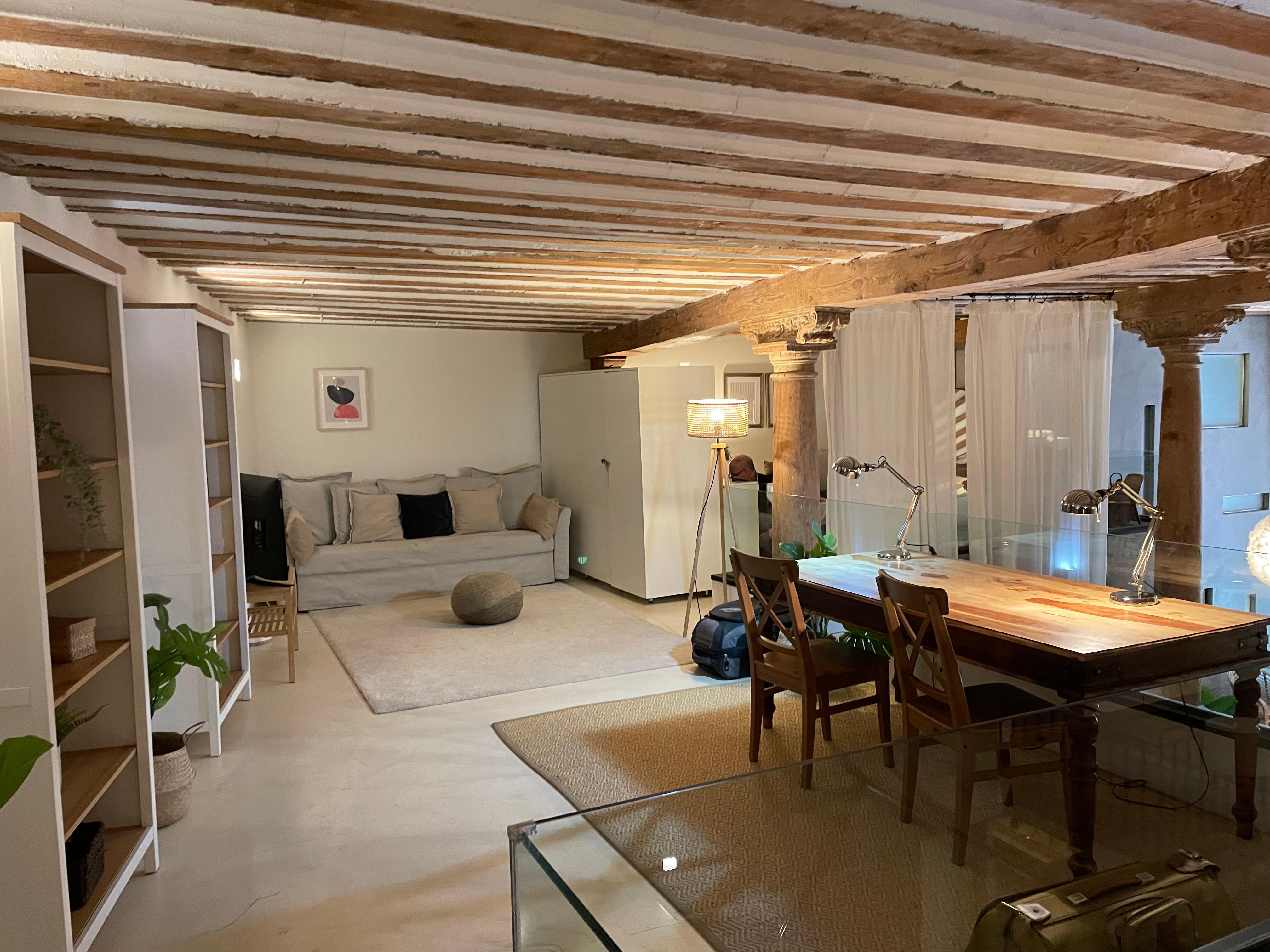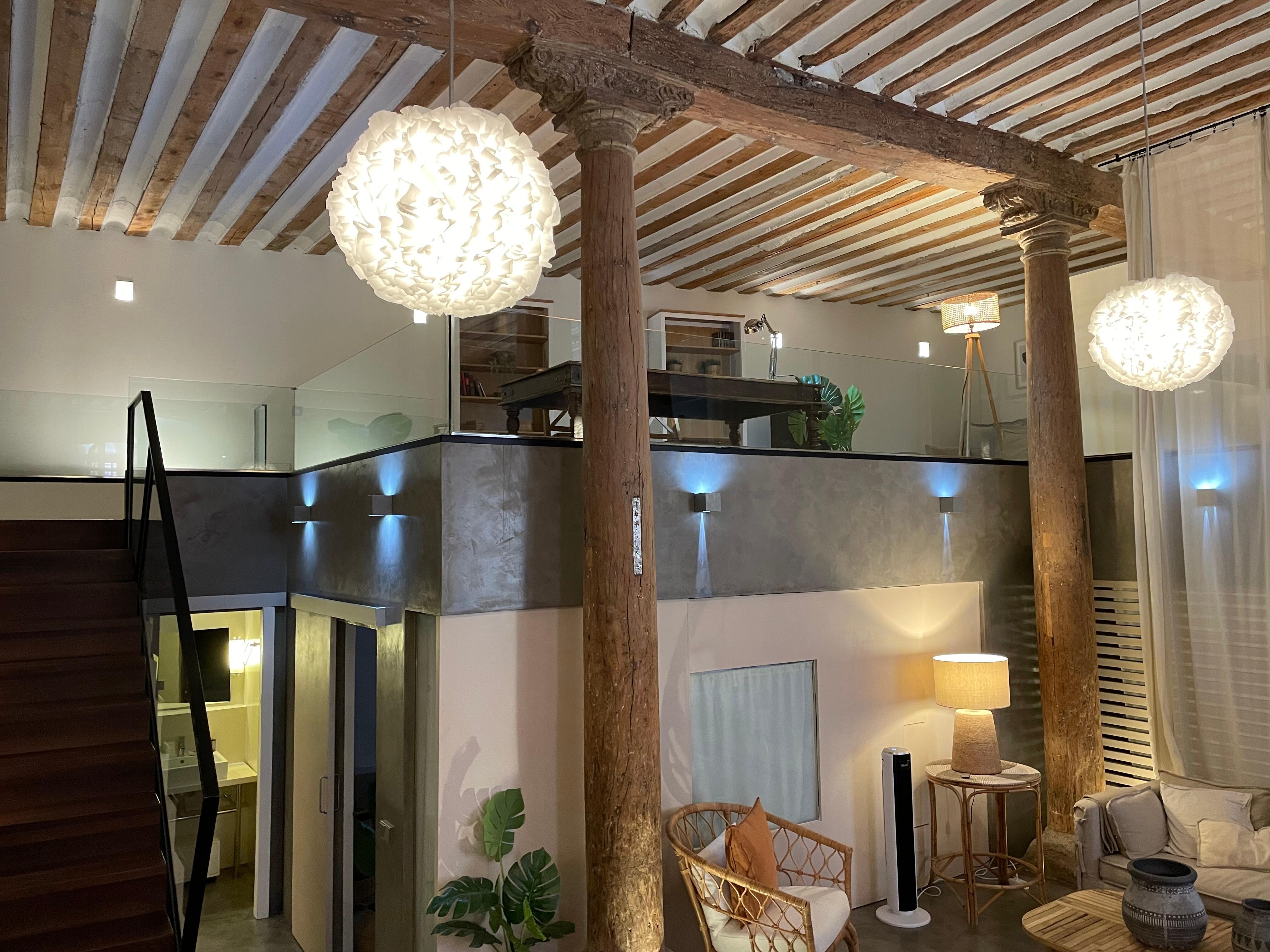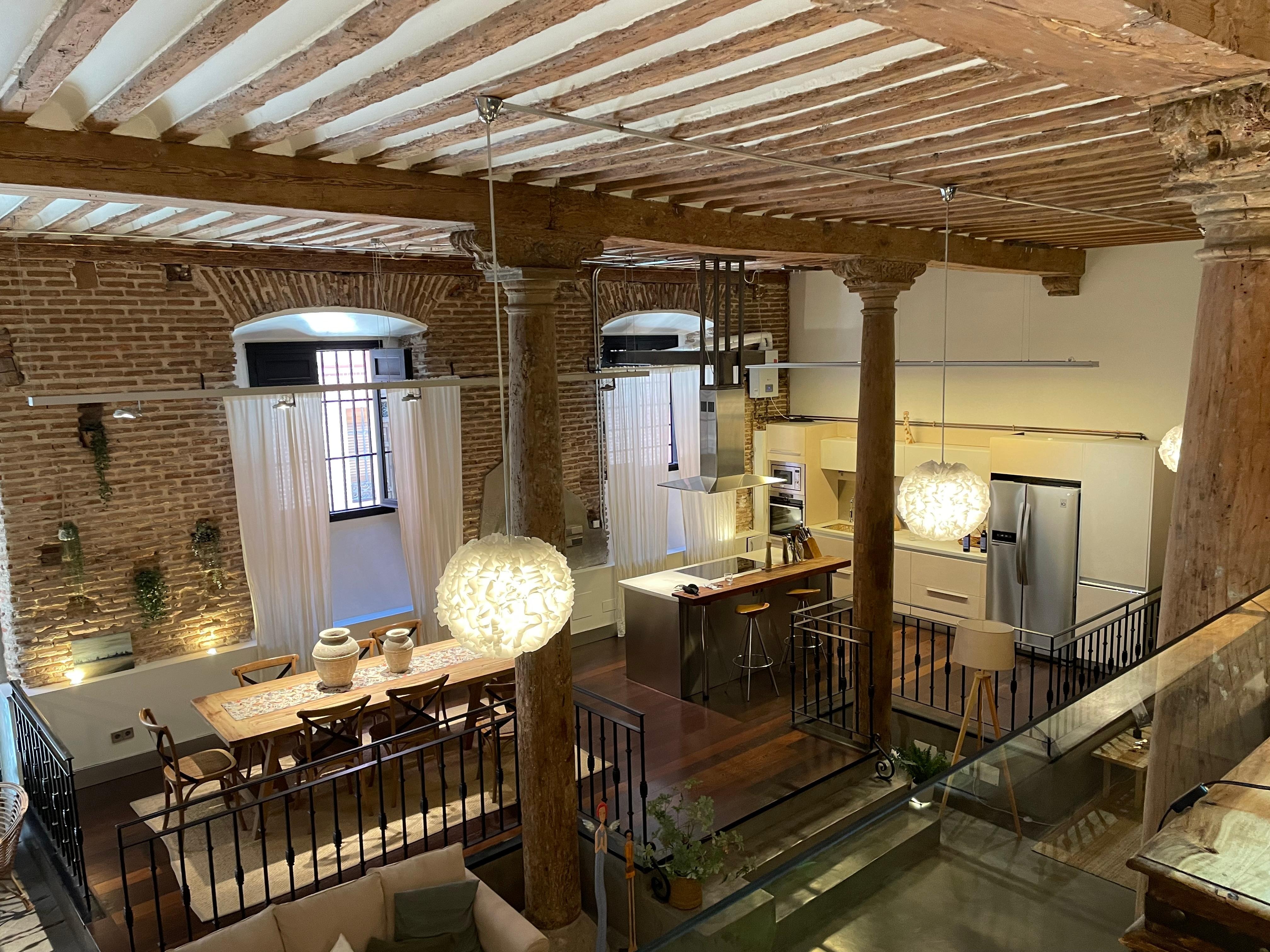 The loft is designed around the central floor where the spacious living room, kitchen and dining room are located at different heights. Impressive ceilings more than five meters high where original columns of antique wood stand out.