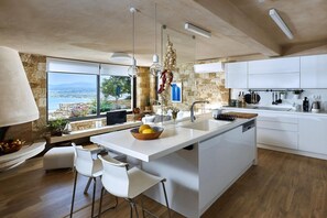 Perched in Crete, Villa Vollard offers a luxurious retreat for up to 11 guests. Unwind in the spacious living area with convertible sofa bed or indulge in one of two fully equipped kitchens. Enjoy outdoor dining under bamboo pergolas, BBQs and a traditional stone oven amidst lush greenery and unique sea views.