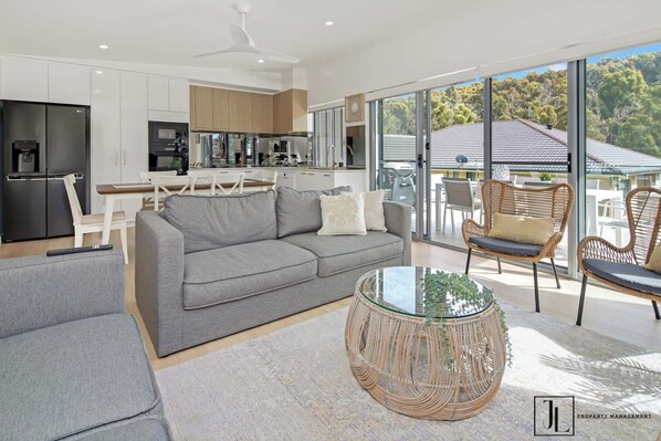 This modern townhouse combines comfort with a relaxed beach vibe. Upstairs, the open-plan living, dining, and kitchen area offers treetop views and a refreshing ocean breeze, making it the perfect space to unwind after a sun-filled day. Each bedroom is designed in soothing neutrals, with the main bedroom featuring an ensuite and TV.