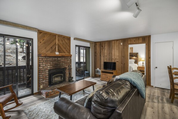 Step inside to an open-concept living area featuring a plush sofa with a queen sleeper, wood-burning stove, flat-screen TV, and access to the private deck. The dining area seats four, with additional bar seating at the kitchen counter. The kitchen is fully stocked with the essentials you need to prepare meals or enjoy après-ski drinks.