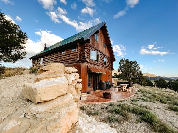 Our luxurious log cabin sits on over one hundred scenic acres offering a rustic and intimate escape in the rugged wilderness. Our gated entrance is on a private road with a scenic winding driveway that leads you to the main level of the cabin. Opening the double doors into the main floor of the cabin you will notice right away the gorgeous walnut wood flooring that was milled locally in Mancos. The kitchen is fully furnished with custom cabinets, granite countertops and a large copper sink. It is also thoughtfully stocked with all of your cooking and house hold needs. Right off of the kitchen is the dining area with a gorgeous one of a kind, locally made aspen and ponderosa pine table that seats 10. This large open floor plan also includes a living room with a gas fireplace, a 40" HDTV and mountain views in every direction. In the primary suite you can lie in your king size bed at night and look out of the window at gorgeous views, possibly a full moon as it sits above the Mesa Verde National Park and watch the stars as they tell you the secrets of the ancient pueblo Indians who lived there before. Don't bother looking for your slippers because if you have to get up in the night the floors are heated so you will come back to bed feeling cozy and warm. The primary bath includes a sauna with hand made tiles created by a local artisan and more beautiful views. Head upstairs to another primary suite with a king bed, full bath and a large seating area for you to enjoy the views of the La Plata mountains while reading a book and relaxing. Down stairs you will notice two bedrooms and a full bath as well as a laundry room. The first room has a set of full size bunk beds and a game area that leads out to the back patio. The next room is another suite with a full living room that includes a 60" tv with surround sound, and kitchenette that includes a sink coffee station and refrigerator. This room offers another very comfortable king size bed and has no windows which is perfect for movie nights or those of you who enjoy black-out dark for sleeping. All of our beds are made with 100% Long Staple Pure Egyptian Cotton - Sateen Weave sheets for your comfort. These natural Egyptian Cotton, soft and crisp sheets are free from harmful chemicals & certified 'Made in Green' . Our cabin sleeps no more than 10 people. Grab your towel and head out to the back patio, slip into the hot tub with a glass of wine to enjoy a starlit night next to our custom fire pit. Our back patio is stocked with a picnic table and two grills for your enjoyment. Come have your western vacation here at El Rio Mancos and create memories that you will carry with you for a lifetime.