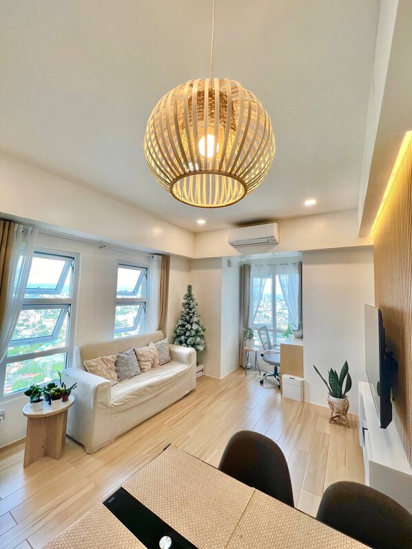 All things inside our unit from furnitures, sheets and kitchenwares are strictly picked to follow the inspiration. To make you feel at home, our unit has all the necessary things like dedicated workspace, 100MBPS high speed fiber internet, 55” Smart TV, refrigerator, AC, induction cooker, rice cooker, electric kettle, microwave, kitchenwares, basic toiletries (toothbrush, soap, tissue, slippers), towels, shower water heater and free drinking water. Our bedroom can only accommodate 2 persons but we can provide an extra floor mattress for the 2 extra persons.