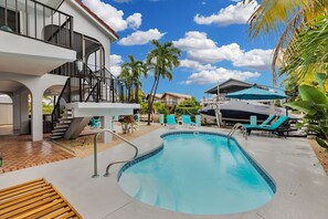 Unwind in the heart of the Florida Keys at this canal-front home, boasting an open-concept living area with 3 bedrooms and 2 full bathrooms. Take a dip in the saltwater pool or unwind on your private balcony overlooking the pristine canal, surrounded by outdoor dining options and a grill.