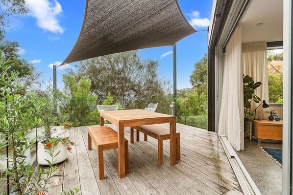 Perched on a hill overlooking Port Phillip Bay, this beautifully presented studio apartment is perfect for couples looking to unwind after exploring the Mornington Peninsula. With a queen bed, kitchenette and raised deck with outdoor dining, you can relax in comfort.