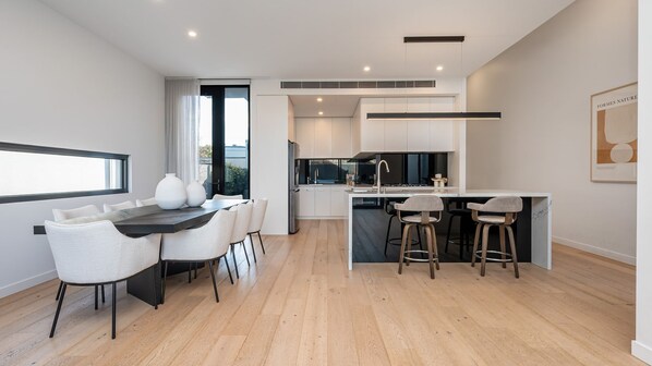 Welcome to The Executive – a striking, architecturally designed townhouse offering a sophisticated stay in the heart of Caulfield South. This beautifully crafted home features four spacious bedrooms, two luxurious bathrooms, and a convenient downstairs powder room. The open-plan living area is filled with natural light, flowing seamlessly into a sleek kitchen and dining space, perfect for entertaining or unwinding. With reverse cycle heating and cooling throughout, a secure backyard with gas BBQ, and off-street parking for up to three vehicles – including a double garage with EV charging capability (additional charges apply) This residence offers elevated comfort for families, professionals or groups seeking a refined city-base.