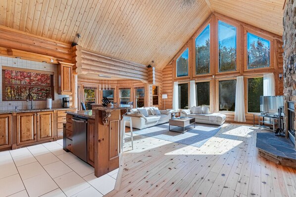 Deer 59 is a two-storey chalet with cathedral ceilings and expansive windows that bathe the space in natural light. On the main floor, there is a fully equipped kitchen, a dining area, a living room with a wood-burning stone fireplace and a powder room. On the same floor, you`ll find the master bedroom with a king bed and an en suite bathroom, as well as another guest room with a king bed and an en suite bathroom.