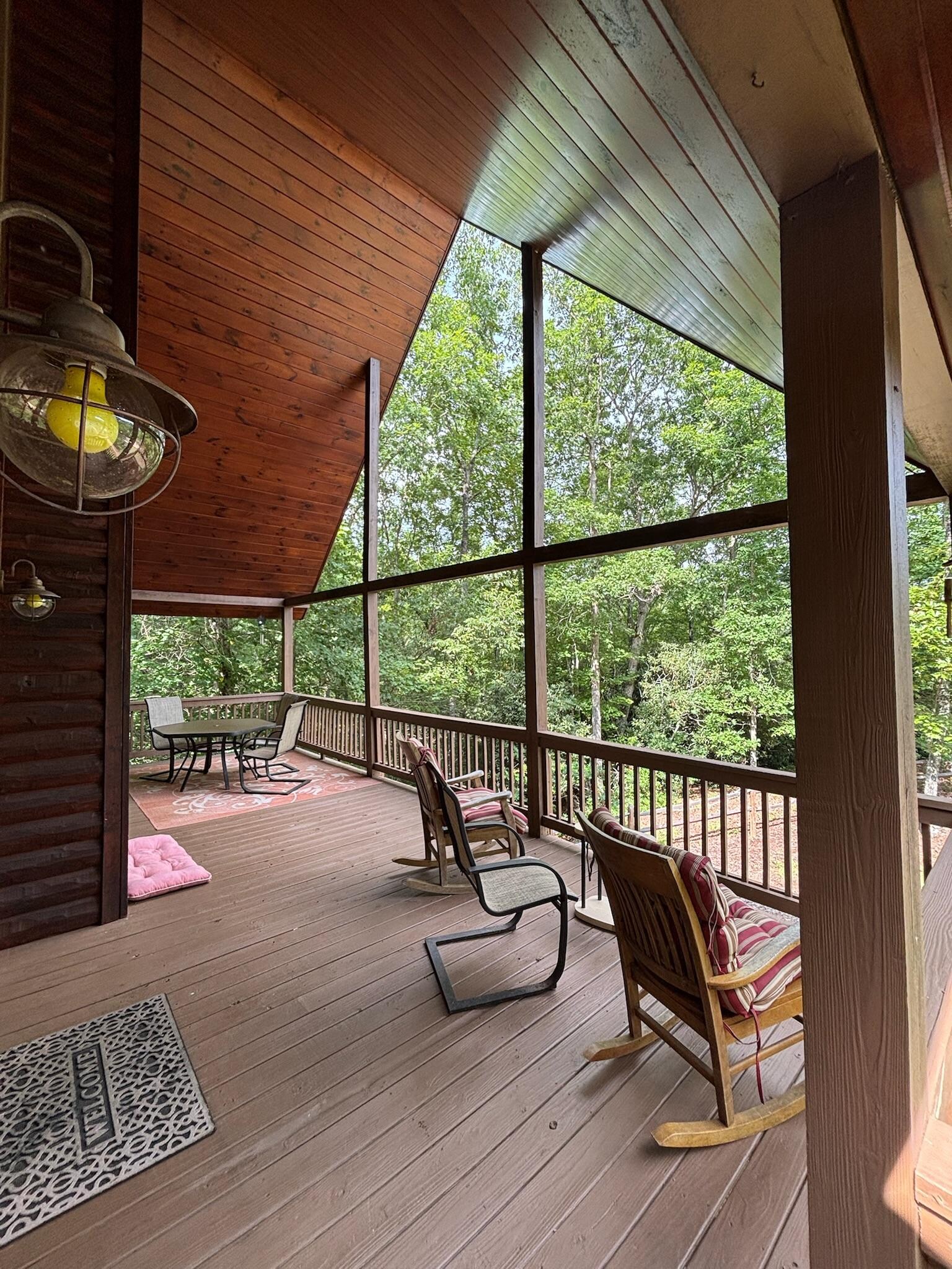 Sophie's Retreat, nestled in the hills of Blue Ridge, offers a rustic lodge atmosphere with wood accents and high ceilings. Enjoy an expansive deck complete with a hot tub and gaze out at the lush foliage while playing pool or watching movies inside.