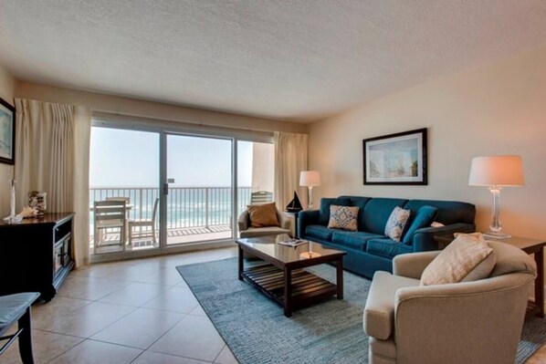 This unit has the highest rating for attractiveness, decor, and comfort. It is a bright, cheerful, well-appointed 2-bedroom, 2-bath, ocean-front condo overlooking the sand, surf, and sea. Note also the Gulf-front pool. Check out our photos to see for yourself the beauty of this unit. Gorgeous 'Ivory Coast' all-granite counters in kitchen and bathrooms.