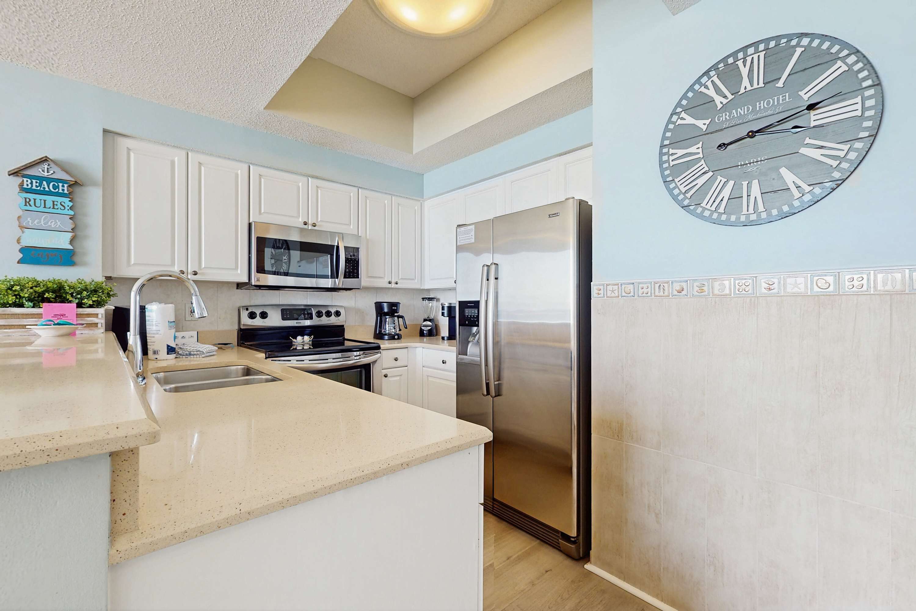 Upon entering this one-bedroom flat, you will notice the contemporary beach style and nautical accents that immediately plunge you and your guests into vacation mode. The open living area features a comfortable seating ensemble comprised of a couch that doubles as a queen-size sleeper sofa and two leather armchairs. These face a wall-mounted TV for entertainment, and sit beside a sliding glass door that leads to a breezy balcony. Spend some time out here enjoying the fresh air and relaxing to the sound of the rolling waves. Head back inside to find a hardwood dining table that includes seating for four. The kitchen includes a granite-topped bar with three stools, stainless-steel appliances, and the space you need to serve up a classic beach meal.