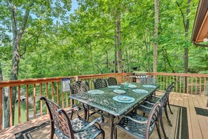 Wake up to serene lake views at ALL DECKED OUT, a tranquil haven where comfort meets tranquility. This spacious home features multiple decks, a private dock, lounge chairs for sun-kissed afternoons and an outdoor dining table perfect for family gatherings. Cook meals in the well-stocked kitchen or unwind with games in the lower level's game room.
