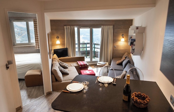 From the dining table if you take a few steps down you'll get to the living room with 2 single sofas that can be used as beds and a sofa. This cosy space will let you access a nice balcony to enjoy the view of Hauts-Forts & place du téléphérique.