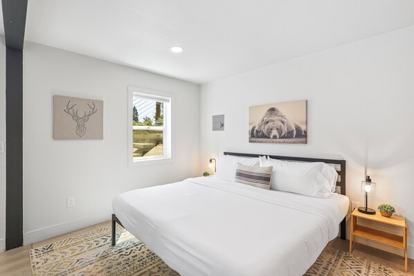This remodeled studio cabin is spacious, open, and naturally lit (4 windows)! Mountain modern finishings with updated kitchen and bathroom, new lighting, paint and furnishings throughout while maintaining the rustic beauty of this cedar lodge. Includes brand new super comfy King bed and 4k HD TV! Lightning fast WiFi with 500 mb speeds and off street parking is included right in front of this unit.