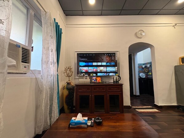 Located in Mumbai's upscale Khar neighborhood, this retro 1-BHK apartment offers a cozy living room with a 55-inch Smart TV and equipped kitchen. Explore the area's fine dining restaurants, sports facilities like Wellington Catholic Gymkhana, and art galleries like Painted Rhythm.